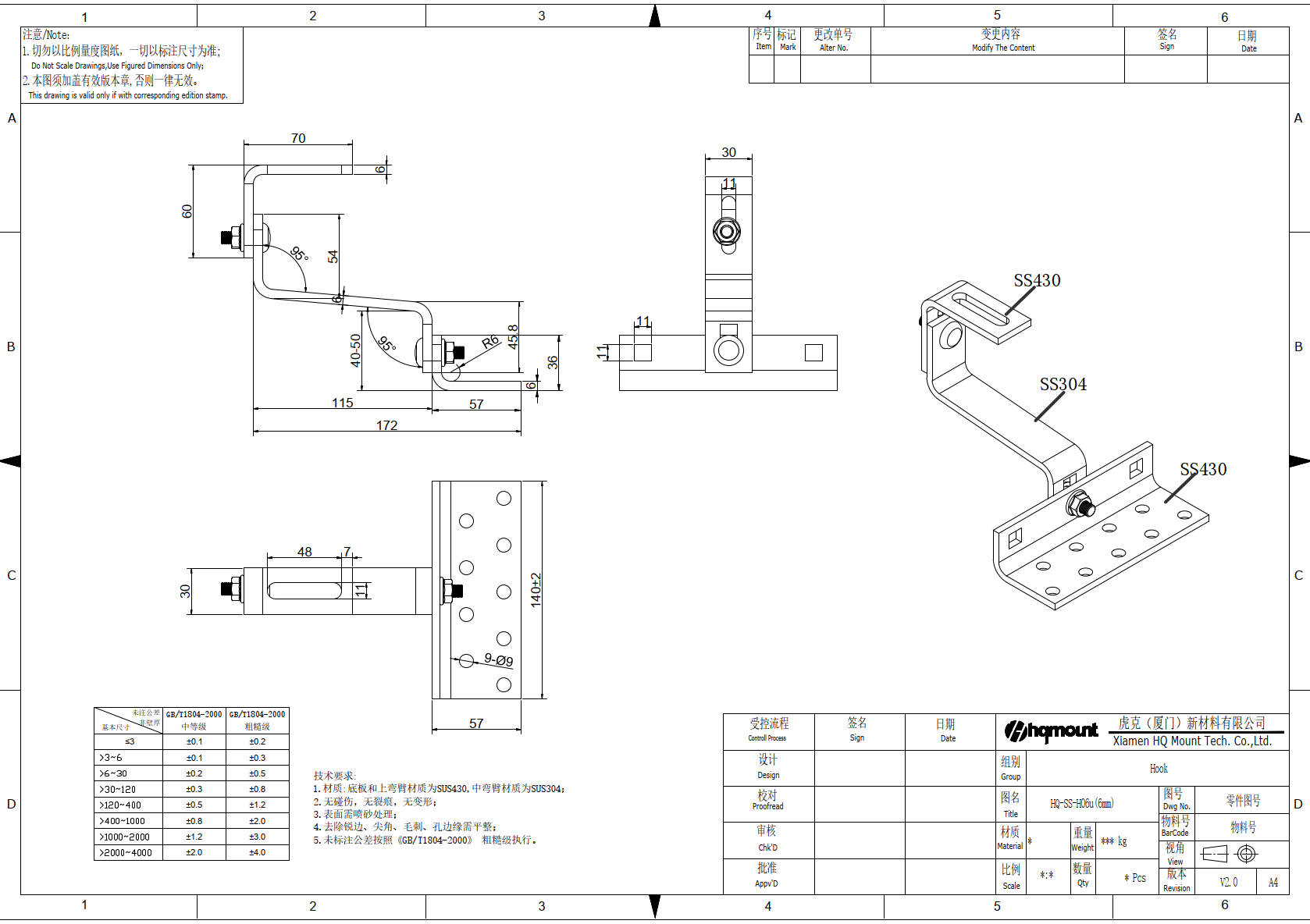 Der Dachhaken ist für hohe mechanische Belastungen ausgelegt und erfüllt die Anforderungen an moderne PV-Montagesysteme. Die Verarbeitung erfolgt gemäß gängigen Toleranznormen (GB/T1804-2000), wodurch eine gleichbleibend hohe Qualität sichergestellt wird