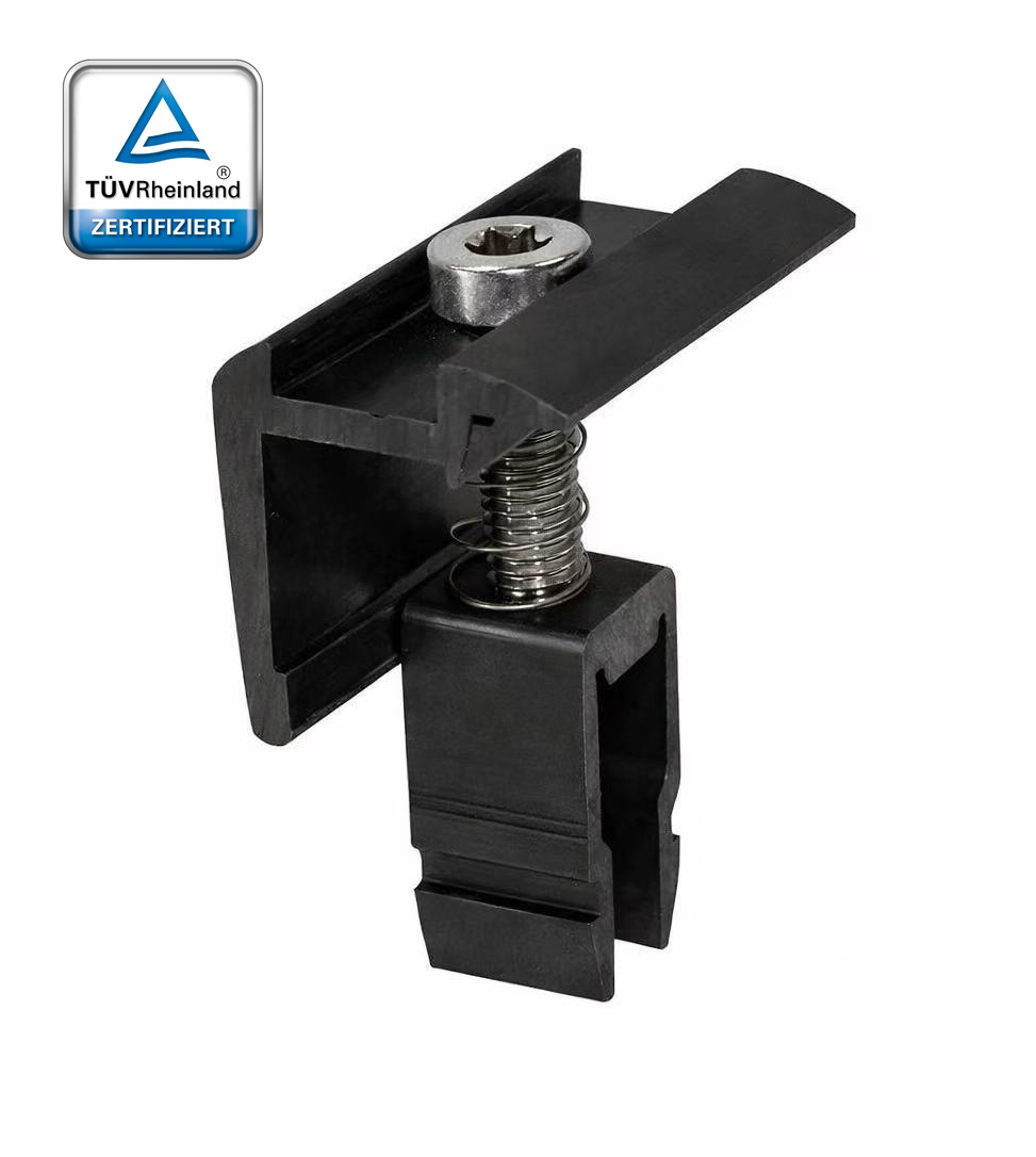 Diese Endklemme im Klicksystem vereinfacht die Installation erheblich und bietet dennoch eine stabile, langlebige Befestigungslösung für PV-Module. Erhältlich bei DNS Solar.